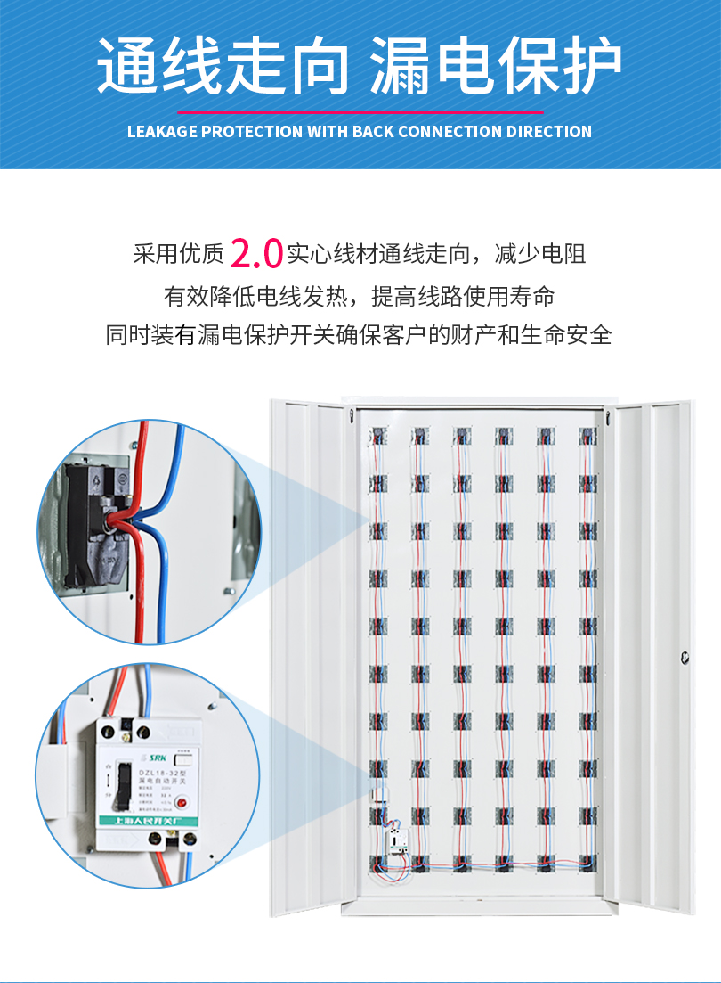 電源線全部采用2.5mm2實心線材,額定電壓為標(biāo)準(zhǔn)生活電壓220V,載荷電流為20A,負(fù)載功率為4400W。日常用手機充電功率為10-15W左右,可滿足290部(按15W計算)手機同時充電,而本手機柜可達(dá)到門數(shù)為100門,電源線材遠(yuǎn)遠(yuǎn)滿足充電需求;同時具有漏電保護功能,當(dāng)發(fā)生漏電時,能夠及時將電源切斷,保護充電設(shè)備安全,需手動復(fù)位方可通電,防止因漏電造成電子設(shè)備損壞。