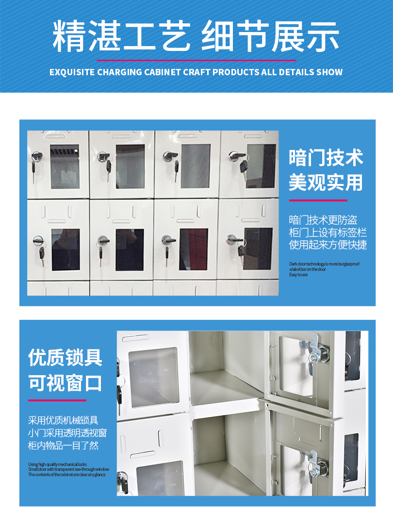 小門設(shè)計單獨鎖具,單柜單開,可實現(xiàn)一人一鎖;上方設(shè)計標(biāo)簽卡槽,便于粘貼姓名銘牌等信息,方便識別與管理,右下部設(shè)計透明亞克力觀察窗,便于觀察手機存放情況;內(nèi)部采用暗門折邊設(shè)計,有效防止刮手。